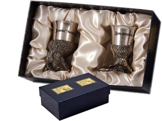 Основание стопок в виде головы кабана и лося изготовлено из латуни художественным литьем.