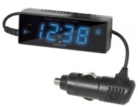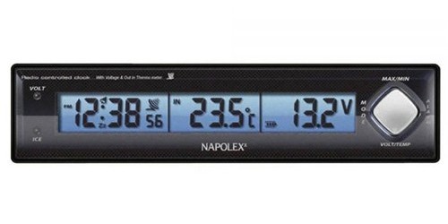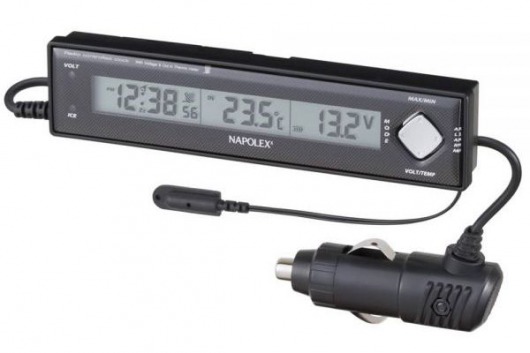 Термометр in/out с анализатором напряжения Napolex FIZZ-890 - это многофункциональный прибор, который имеет подсветку 2-х цветов (синий/оранжевый), будильник с функцией отсрочки, календарь, датчик гололёда, память максимальной/минимальной температуры, вольтметр с индикацией уровня заряда акб. Питание термометра от батарейки CR2032 (подключение к гнезду прикуривателя для работы подсветки и измерения уровня заряда и напряжения в акб). Крепится устройство с помощью специального кронштейна с липучкой на горизонтальную поверхность.