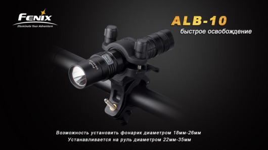 Велосипедное крепление Fenix ALB-10 позволяет регулировать направление света от закрепленного фонаря, поворачиваясь в диапазоне 30° по горизонтали. Кроме того, во время остановок фонарь можно быстро отсоединить от велосипеда и использовать в качестве ручного.
