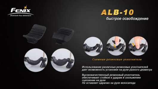 Конструкция крепления максимально проста и позволяет буквально двумя действиями установить его на руль велосипеда или же снять. Fenix ALB-10 подходит для рулей диаметром 22-35 мм. Благодаря съемным резиновым накладкам разной толщины, которые входят в комплект к аксессуару, крепление надежно фиксируется и не царапает руль. Второй разъем, предназначенный для фонаря, тоже регулируется по диаметру: от 18 до 26 мм. Поэтому велокрепление совместимо с такими моделями фонарей Fenix: UC35, UC40, UC45, TK22, TK21, TK15, TK11, TK12, TK09, PD35, PD22, PD12, LD22, LD12, RC15 и другими.