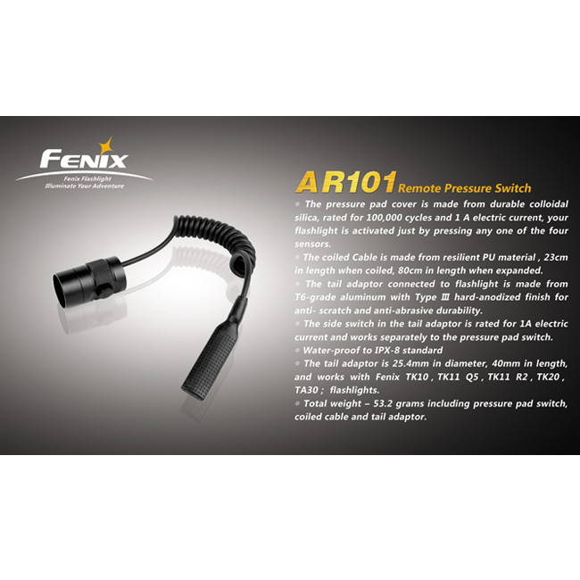 Модель выносной кнопки Fenix AR101 состоит из корпуса, витого шнура и контактной площадки. Ее корпус с резьбой накручивается вместо обычной крышки фонаря, на которой располагается стандартная кнопка его включения. А соединенная с ним контактная площадка закрепляется в любом удобном для пользователя месте ствола оружия. Витой шнур может растягиваться в пределах от 23 до 80 см, что позволяет свободно выбирать месторасположение контактной площадки для различных видов гладкоствольного и нарезного оружия. Эта площадка и является кнопкой включения фонаря. Внутри нее находится четыре контактных точки. Кнопка сработает, если будет задействована хотя бы одна из них, что обеспечивает высокую управляемость фонарем при помощи данного аксессуара.