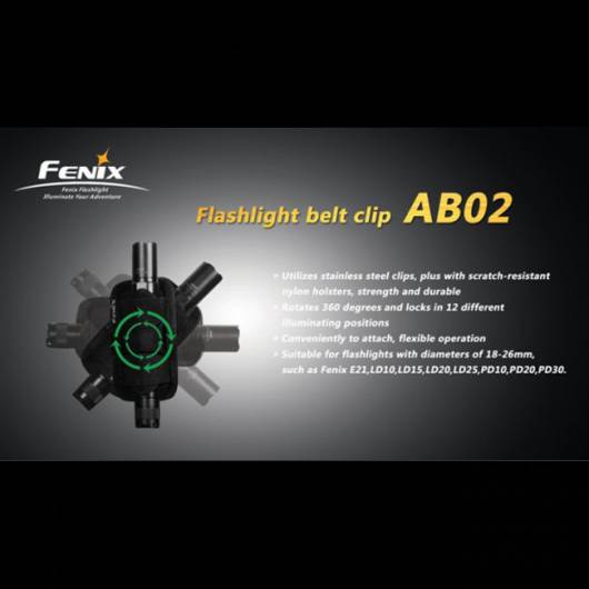 Клипса-держатель под названием Fenix AB02 совместима со множеством различных моделей фонарей из серий E, LD, PD, TK, UC. Для каждого из них такая клипса открывает возможность постоянно быть доступным для использования. При этом, руки владельца фонаря остаются совершенно свободными. Аксессуар представляет собою широкую стальную клипсу с кронштейном, положение которого легко регулируется. На кронштейне располагается тканевый синтетический чехол с фиксирующим ремнем, который закрепляет положение фонаря по отношению к клипсе и исключает его случайное падение на землю во время использования. Чехол предусматривает возможность полного поворота кронштейна вокруг своей оси. Таким образом пользователь может свободно регулировать необходимое направление для освещения.