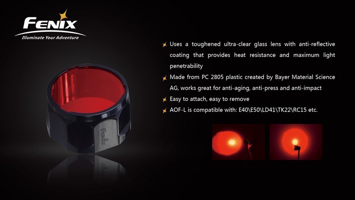 Светофильтр изготовлен из высококачественного поливинилхлорида (ПВХ), стойкого к механическому воздействию, нагреву и перепадам температур. Фильтр является прекрасным дополнением к фонарям Fenix E40, E50, LD41, TK22, TK22 (2014 ed.), RC15, UC45. Отличное решение для любителей ночной охоты.