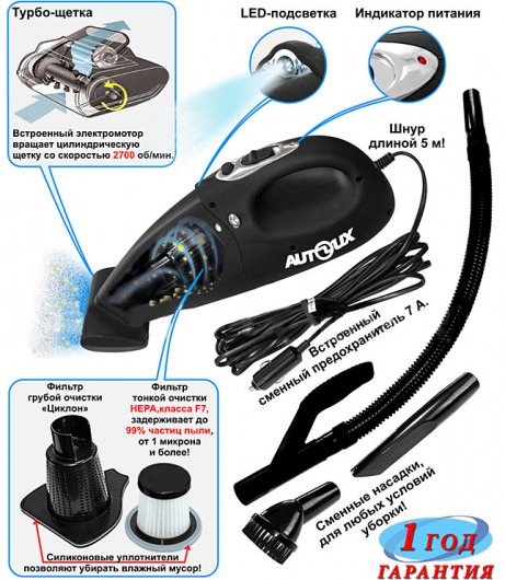 Автомобильный пылесос AL-777 Turbo - легкий и удобный, но при этом обладает просто поразительной мощностью. Идеальная чистота в Вашем автомобиле гарантирована.