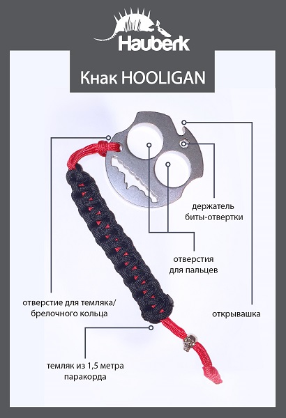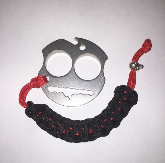 Кнак может иметь разную конфигурацию (Hooligan, Sparta и т. д.), но любой из них имеет 2 эргономичных отверстия для пальцев, благодаря чему он надежно фиксируется в руке. Также кнак удобно держать за плетеную ручку-темляк (темляк – петля или плетеная ручка). Его всегда можно расплести, таким образом у вас в руках окажется 1,5 метра плотной, эластичной веревки-паракорда (ParaCord 550).