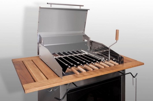 Уникальная функция запекания, не доступная в других моделях грилей, реализована благодаря откидной крышке с дополнительным отражателем. Регулировка высоты поддона с углем (дровами) выполняется при помощи поворотной ручки, находящейся над топкой. Гриль удобно передвигать по участку и даже ставить на наклонную плоскость благодаря блокируемым колесам.