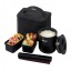 В комплекте: цилиндрическая, герметично закрывающаяся пластиковая емкость, которая вставляется в термоконтейнер из нержавеющей стали, а также 2 пластиковых контейнера и палочками в пенале, и все это помещается в удобной компактной термосумке.