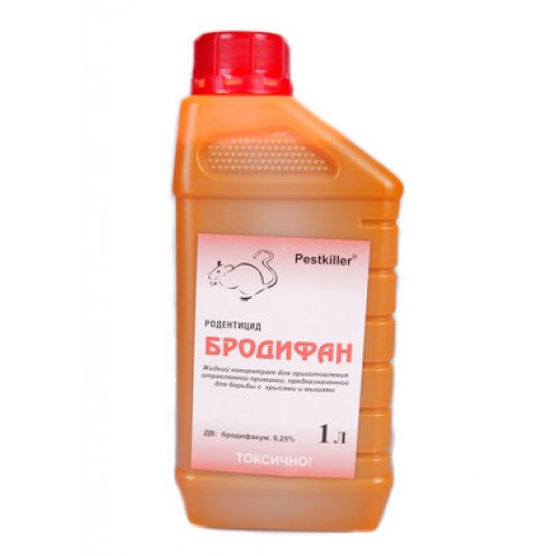 Отравленные приманки для борьбы с грызунами готовят путем тщательного перемешивания 20 мл средства “Бродифан” с 1 кг пищевой основы (очищенное зерно, крупы, комбикорм, каши и другие доброкачественные продукты) до равномерного распределения средства. Добавление растительного масла (3% к весу готовой приманки) или других аттрактантов повышает поедаемость приманки грызунами. Конечное содержание ДВ в полученной приманке составляет 0,005%.