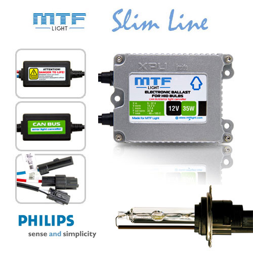 Ксенон MTF Slim line XPU Philips H7 4300K с «обманкой» поможет вам осветить дорогу в любых условиях, не ослепляя. Блоки розжига оснащены специальными микрочипами XPU. Эта особенность увеличивает работу оборудования. «Обманки», встроенные в блоки, позволяют обойти проверку бортовым компьютером. Также в наборе идут две лампы Philips. Они разительно отличаются от обычных характеристиками света. У ксеноновых ламп Филипс превосходные показатели яркости, при этом свет не ослепляющий.