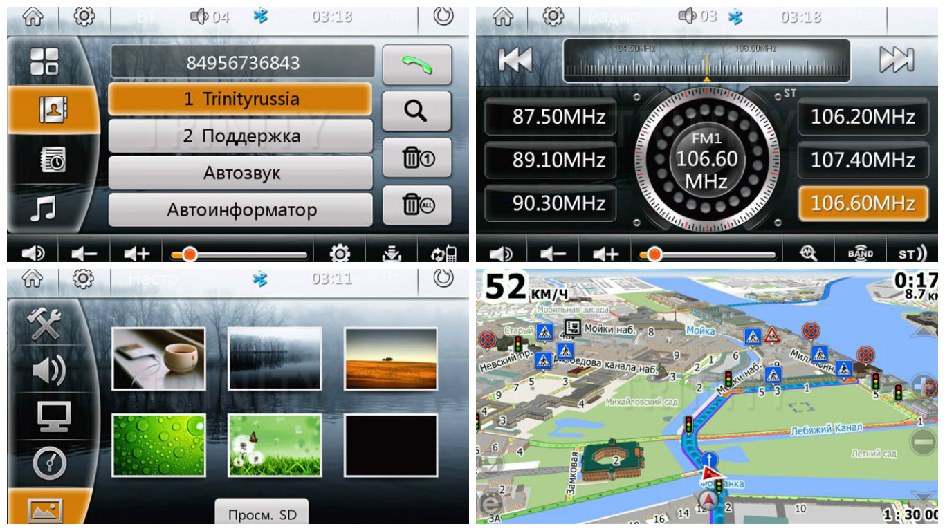 Мультимедийный плеер штатного головного устройства с навигацией Trinity поддерживает большинство форматов файлов. Поэтому выбранный вами диск обязательно будет читаться. Кроме того, штатная голова Trinity оснащена USB и SD-входом. Так что вы легко можете подключить к штатной магнитоле любую флэш-карту и смотреть/слушать любые файлы.