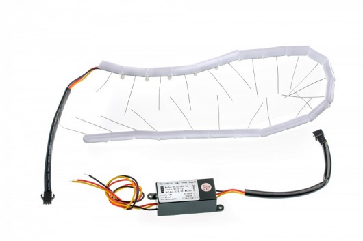 Гибкие дневные ходовые огни (DRL) Optima предназначена для установки в фары автомобиля. Может работать в 2-х режимах: для подсветки и индикации поворота, а также в режиме дневных ходовых огней (DRL).  При повороте лента светит желтым светом, при движении прямо — белым. Диодная лента имеет гибкий корпус, поэтому может быть согнута в любом направлении.