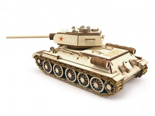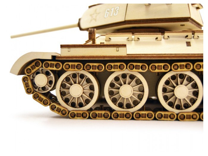 Деревянный Танк Т-34-85 — это очень интересное открытие для любителей моделизма. Представьте, у него вращаются гусеницы, крутится башня и поднимается дуло. Кроме того, нужно отметить, что абсолютно все элементы конструктора сделаны из дерева, а гусеницы собираются из большого количества маленьких перемычек. Поэтому игрушечный танк лучше ездит по поверхностям с небольшой шероховатостью — например, по ковровым покрытиям.