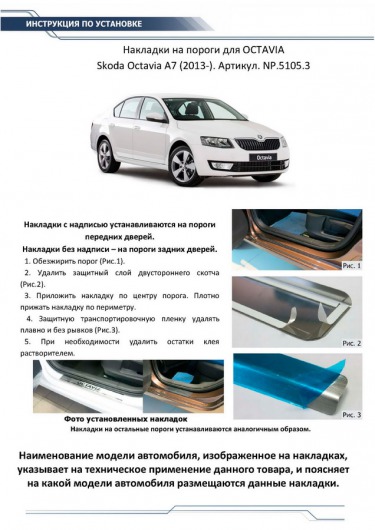 Данные накладки на внутренние пороги «Риваль» разработаны специально для автомобилей Skoda Octavia A7 от 2013 г.в. и полностью повторяют их геометрию. Кроме того, накладки порогов двери Rival очень легко и быстро устанавливаются. И при этом надежно крепятся за счет плотного прилегания морозостойкого скотча.