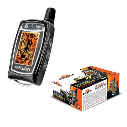 Двухсторонняя автомобильная сигнализация CYCLON 570D v2 включает в комплект 2 ЖК-брелока. Дальность пейджера на передачу сигнала – 600 м., на прием – 1400 м.  Диалоговое кодирование радиосигнала, которое применяется в этой охранной системе, уверенно противостоит код-грабберам. Даже если преступник перехватил сигнал, это не поможет ему отключить систему, т.к. код меняется после каждого нажатия кнопки брелока.
