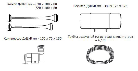 Комплект KIT 977 это ярковыраженный бас на службе Вашего автомобиля. Вы можете разместить устройство под капотом или снаружи автомобиля на свое усмотрение. Основные запчасти можно расположить в разных частях машины: рожок, конечно же, ставится в передней части машины, а вот ресивер и компрессор — в багажнике либо салоне (если нет места в моторном отсеке).