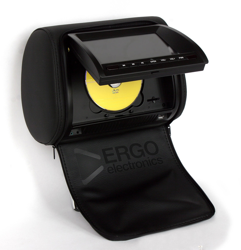 Комплект подголовников с LCD монитором 7" ERGO ER700H состоит из двух подголовников черного цвета, один из которых оснащен встроенным DVD-проигрывателем. Изюминкой данной модели является то, что подголовники имеют специальные чехлы с застежкой-молнией. Таким образом, когда чехол застегнут, подголовник выглядит как обычный и не привлекает постороннего внимания.