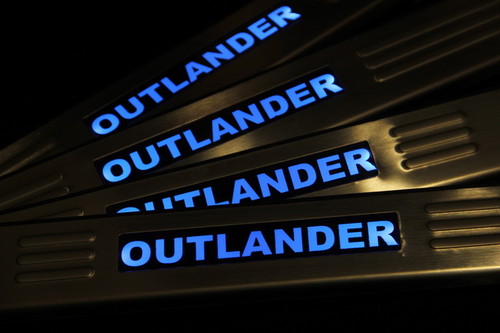 Накладки на пороги с подсветкой Mitsubishi Outlander 2007-2012 г.в. — это не только привлекательный, но еще и весьма функциональный элемент для современного автомобиля. Поскольку дополнительные элементы подсветки должны в первую очередь помогать, а не отвлекать от вождения, накладки на пороги устанавливаются и подключаются к бортовой сети автомобиля так, что они загораются только лишь при открытии двери. Это не только обеспечивает комфортную посадку пассажиров, но и придает автомобилю индивидуальность и стиль. Накладки разработаны специально для Mitsubishi Outlander, поэтому на поверхности накладок — светящаяся символика этого автомобиля. Для подсветки накладок используется около 50 светодиодов. На поверхности накладок присутствуют специальные рельефные полосы, которые обеспечивают хорошее соприкосновение подошвы обуви и поврхности накладок.