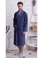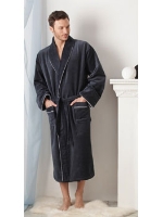 Воротник - шаль в стиле мужского костюма, широкий манжет. По всей длине полов халата, воротника и на карманах - стильная и лаконичная отделка темно-серым, декоративным кантом. Гипоаллергенный материал, обладающий антибактериальными свойствами. Прекрасно впитывает влагу.